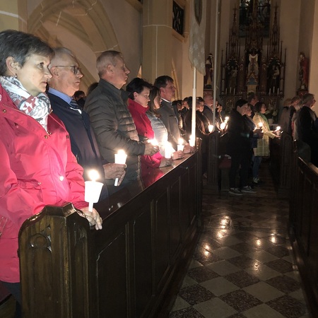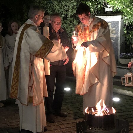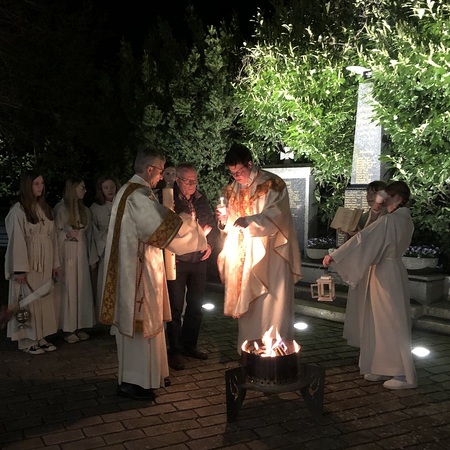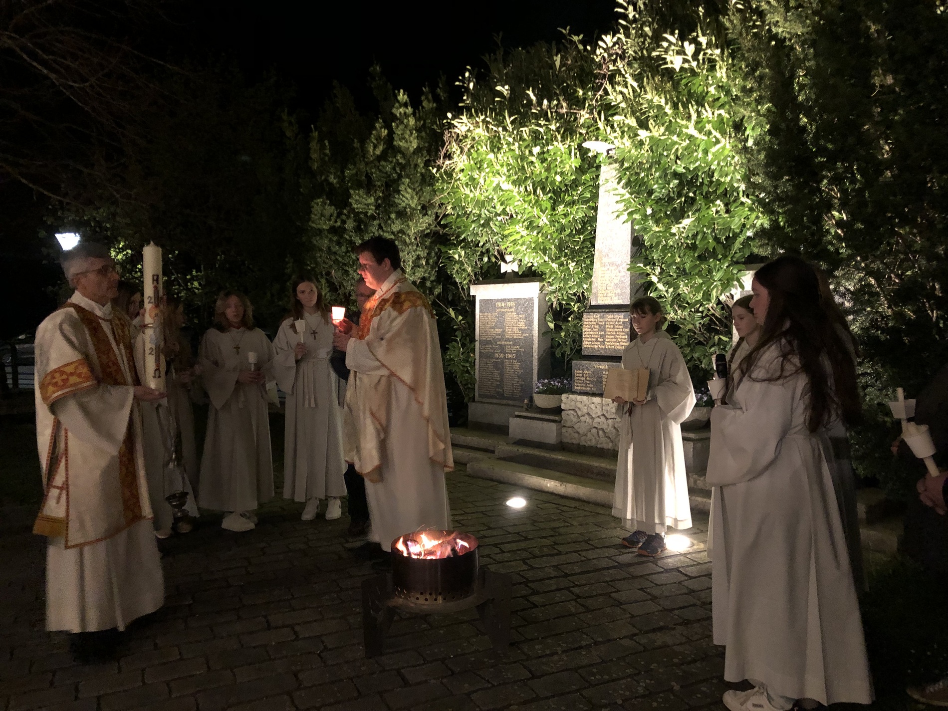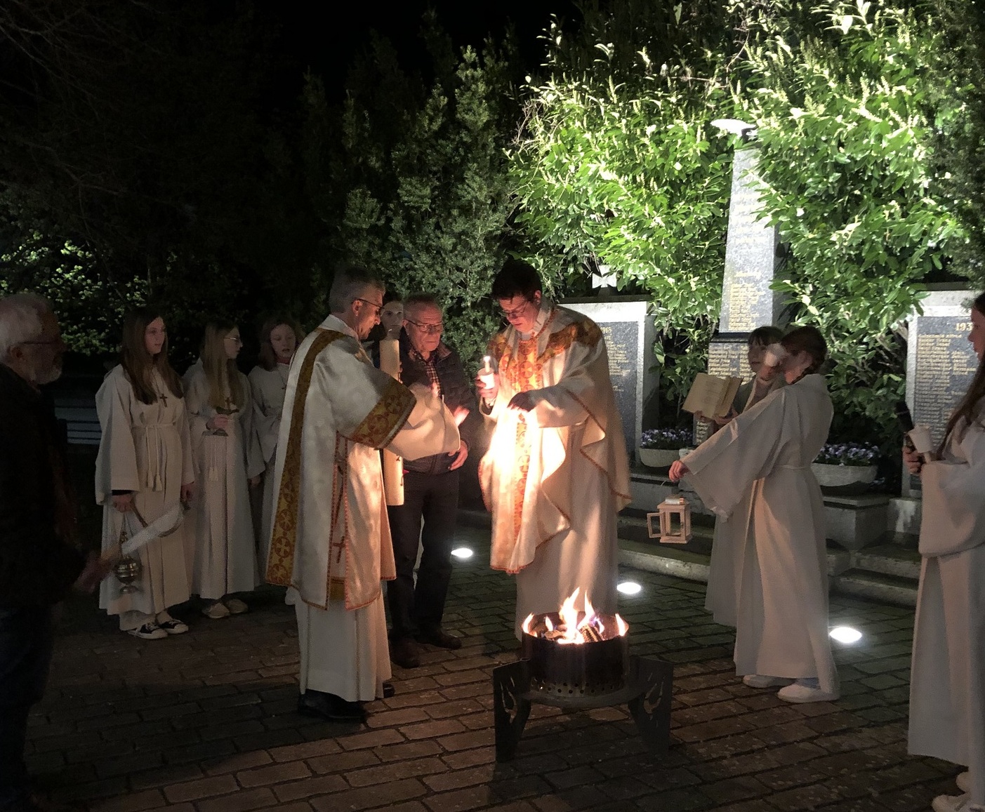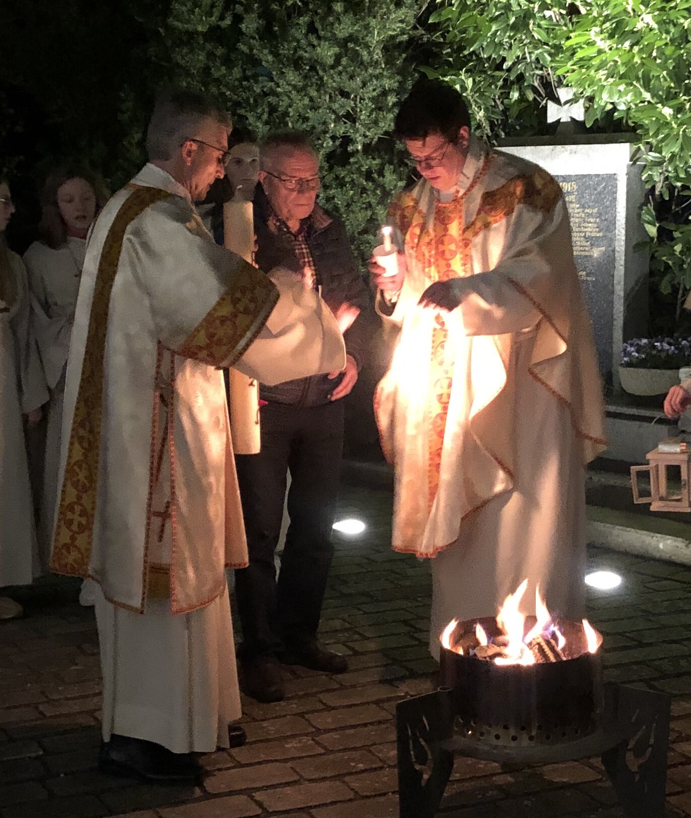 Die Osternachtsfeier am Karsamstat startete mit der Feuerweihe am Kirchenplatz. P. Christoph und Diakon Wolfgang Mühllehner brachten die entzündete Osterkerze gemeinsam in die dunkle Kirche. Berührend und einzigartig die Liturgie des Karsamstags, mit Wortgottesfeier, Tauferneuerung und Eucharistie sowie Weihe der mitgebrachten Osterspeisen.