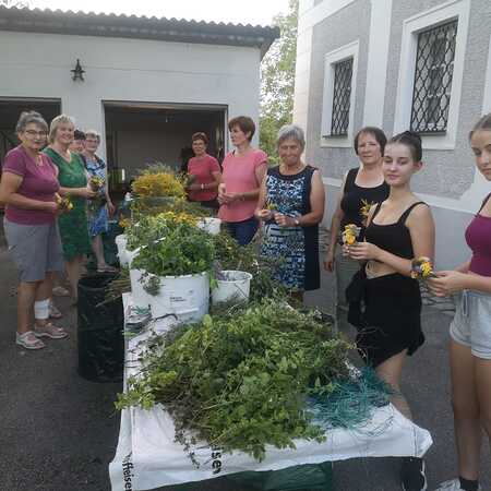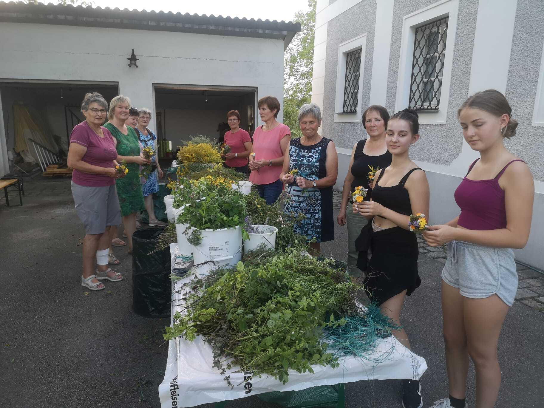 Am Vorabend zum Hochfest Maria Himmelfahrt verwandelte sich der Pfarrhof in eine würzig duftende Kräuterwiese. Eingehüllt in diese Duftwolke aus verschiedensten Kräuter trafen sich die Frauen der kfb um die Kräutersträußerl für die Kräuterweihe zu binden. Die Sträußerl sind nicht nur optisch eine Augenweide, sondern erfreuen auch mit ihrem Duft. Traditionellerweise werden in die Sträußerl 7, 9 oder 12 heilende Kräuter, wie Scharfgarbe, Rosmarin, Salbei, Pfefferminze, Ringelblume, Thymian, Johanniskraut, Rainfarn, Kamille, Wermut, Baldrian und Lavendel gebunden die Symbole für Schutz und Heil sind.