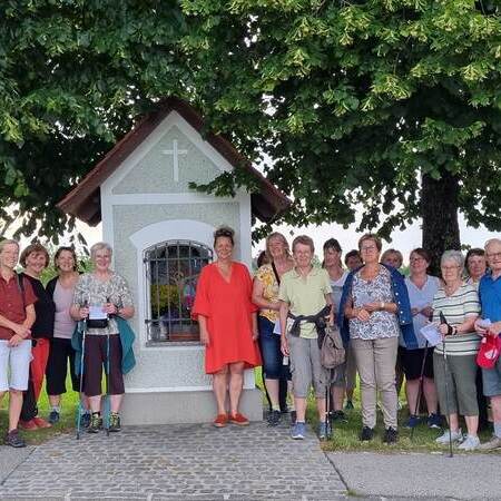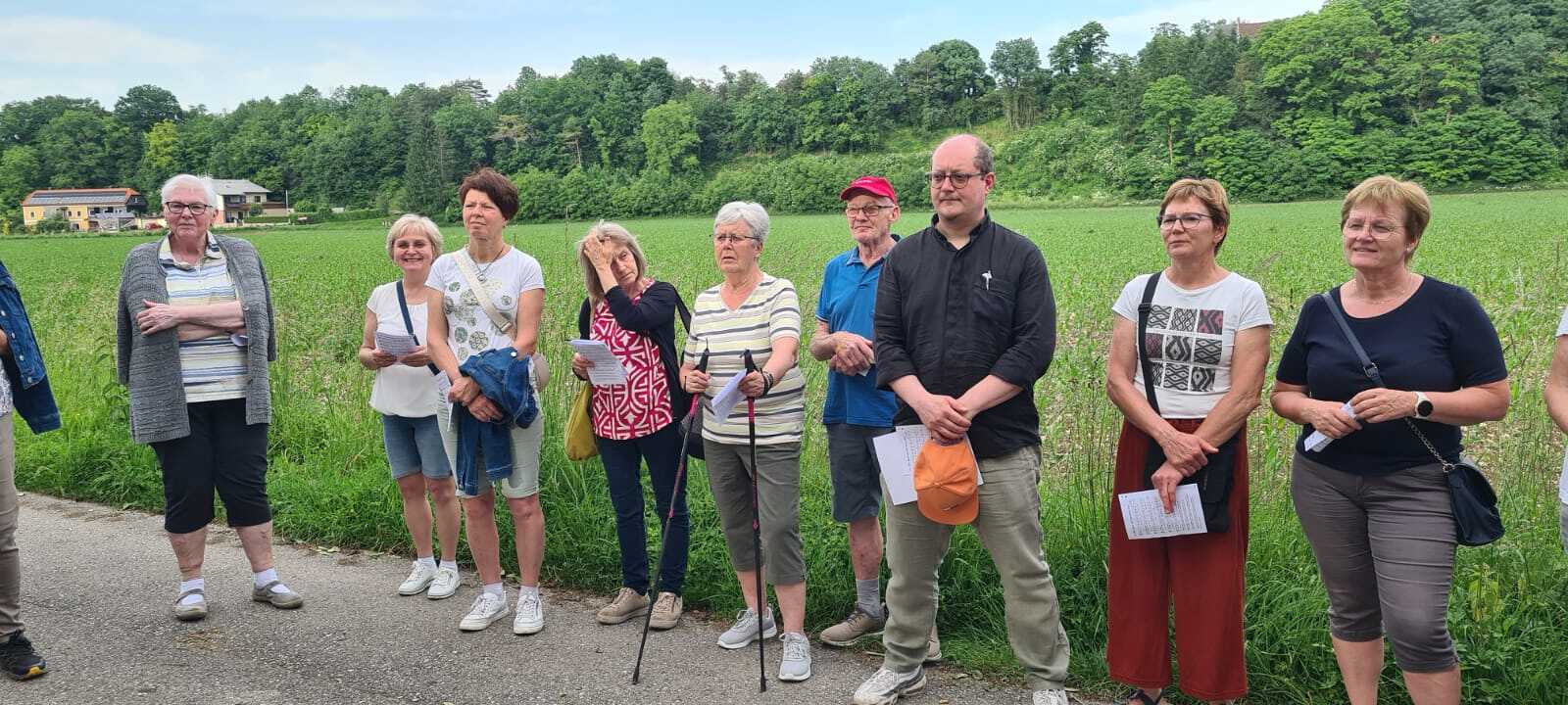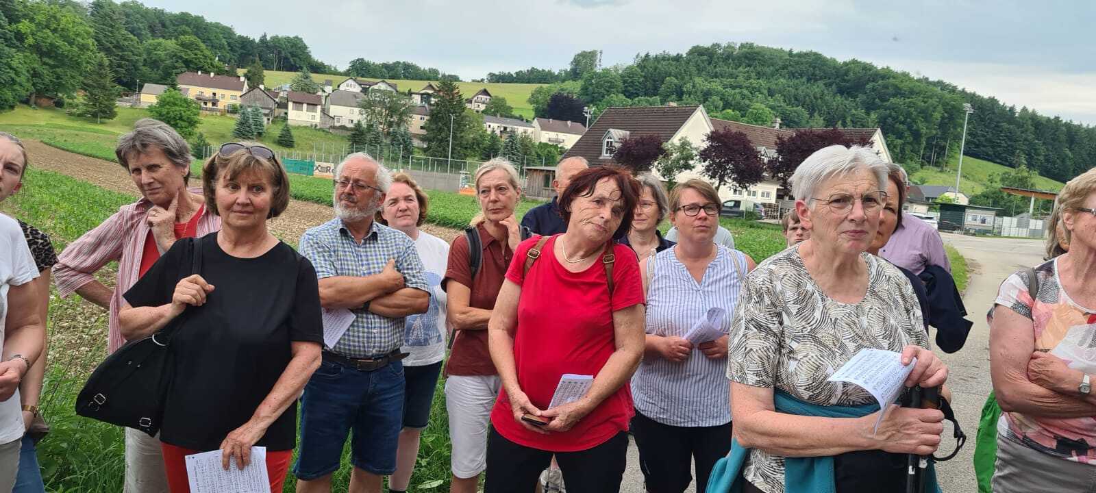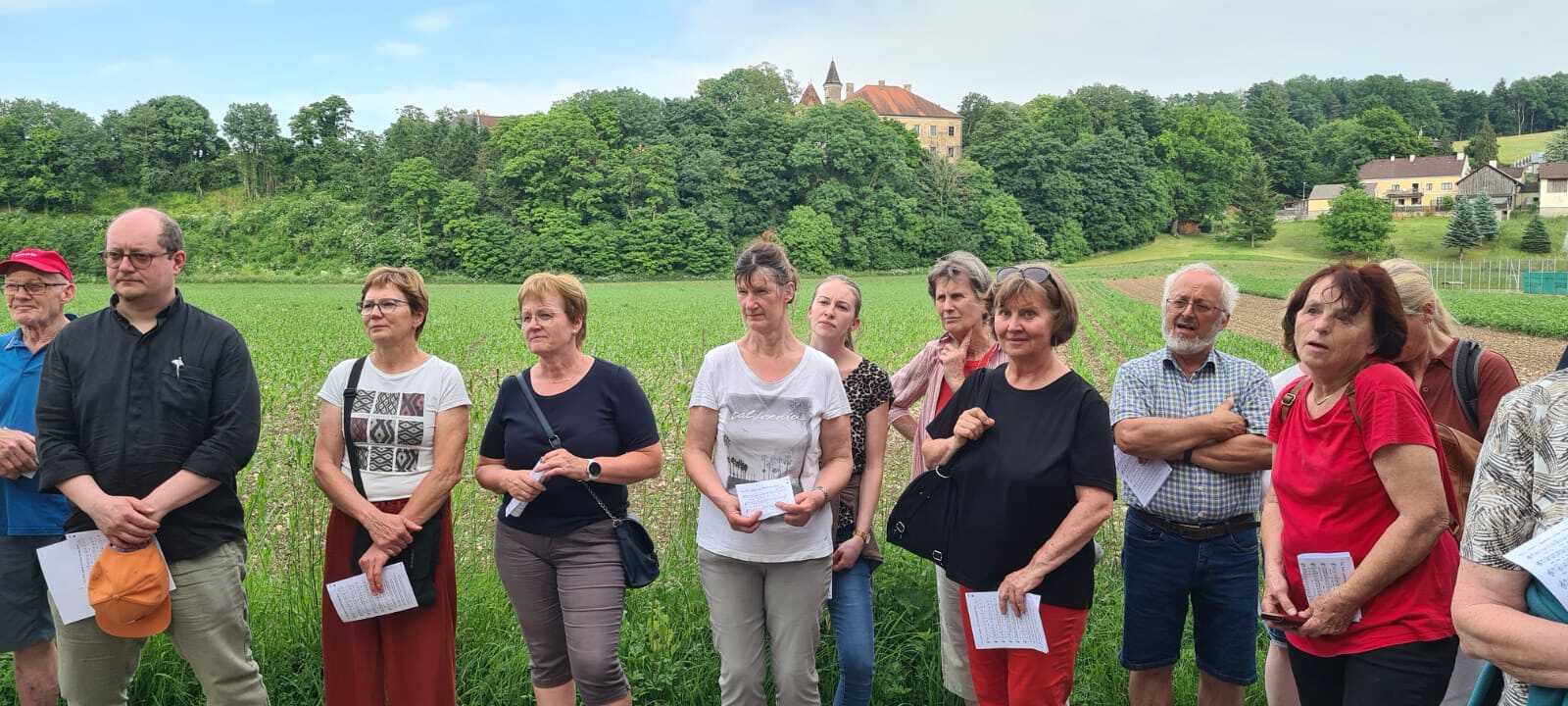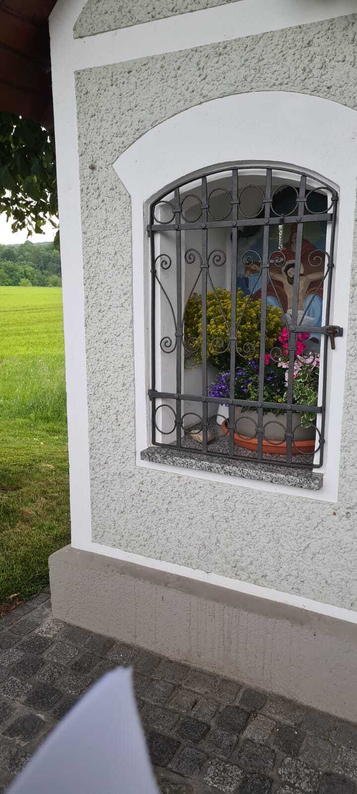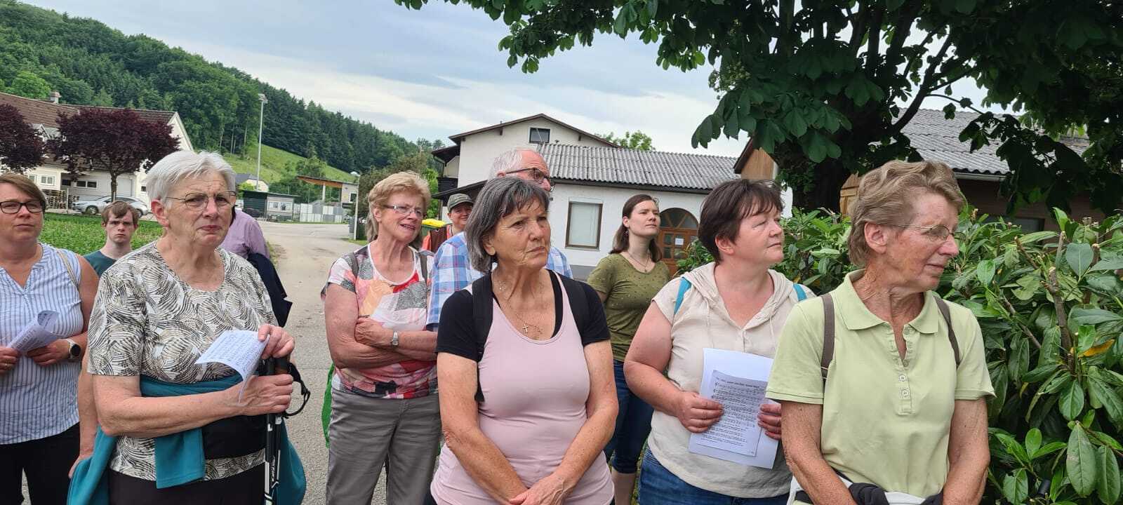 Gestartet wurde beim Bahnhof Kröllendorf, von dort ging es nach einer kurzen Begüßung durch Gerlinde Geiger zur Schwarenthorer Kapelle in der Nähe des Sportplatzes. Nach einigen Worten des Besitzers, Schwarenthorer Thomas, einem Marientext und einem Lied ging es weiter zur Kapelle ins Schloss Kröllendorf. Dort erzählte die Besitzerin Frau Andrea Kafka einiges über die Geschichte der Kappelle und des Schlosses. Nach dem Tagesevangelium fand Pater Vitus passende Worte zum Evangelium und zu den Kapellen. Weiter führte die Wanderung zurück zum Lagerhaus und dann entlang der Bahntrasse zum Marterl im Garten von Frau Anna Schnabl. Nach den erklärenden Worten zum Anna-Marterl gab es einen schönen, hoffnungsvollen und tröstlichen Meditationstext zur hl. Anna.. Die nächste Kapelle auf der Route war die Latzelsberger-Kapelle. Auch dort wurde gemeinsam gebetet, gesungen und Texte verlesen. Nach einer Trinkpause beim Hause Huber- Latzelsberger, die auf grund des warmen Wetters sehr gern angenommen wurde, ging es zurück zum Ausgangspunkt. Die Marienstatue im Garten der Fam. Bruckschwaiger bildete den Abschluss der Kapellenrunde. Auch dort wurde die Gruppe besonders herzlich empfangen und nach Fürbitten und einem Segensgebet mit Getränken und Brötchen bestens bewirtet.