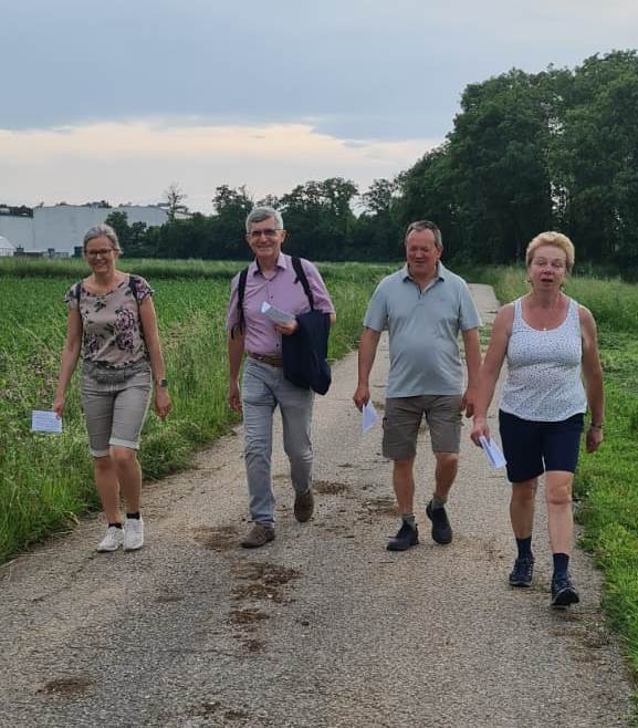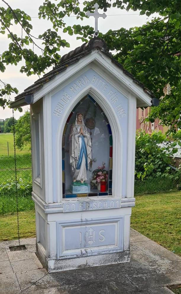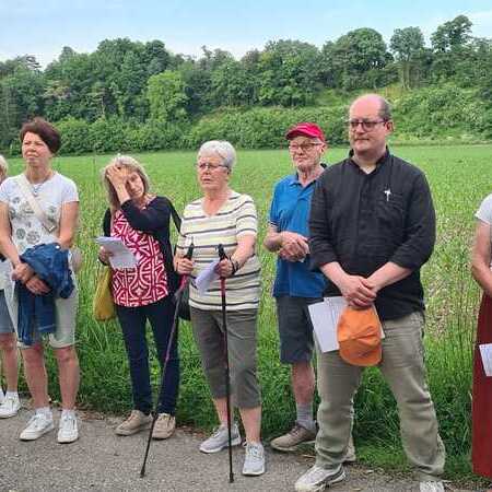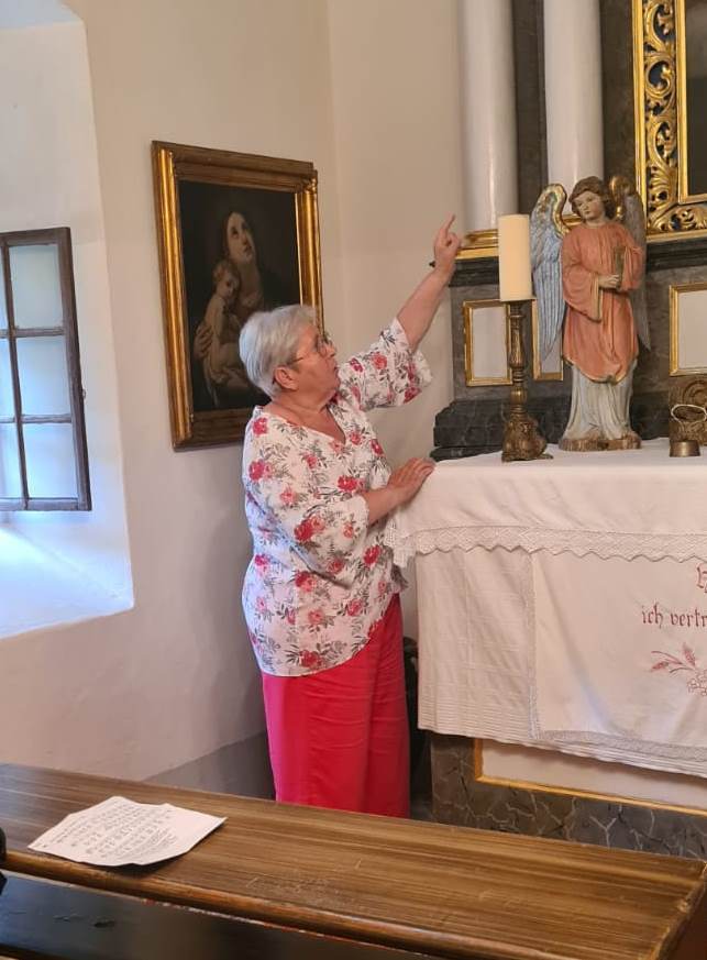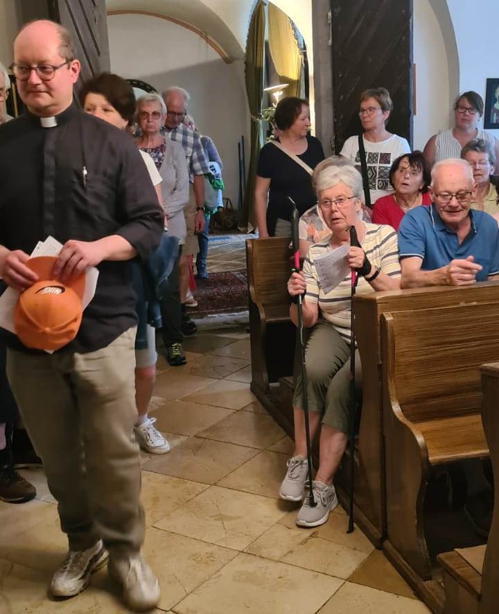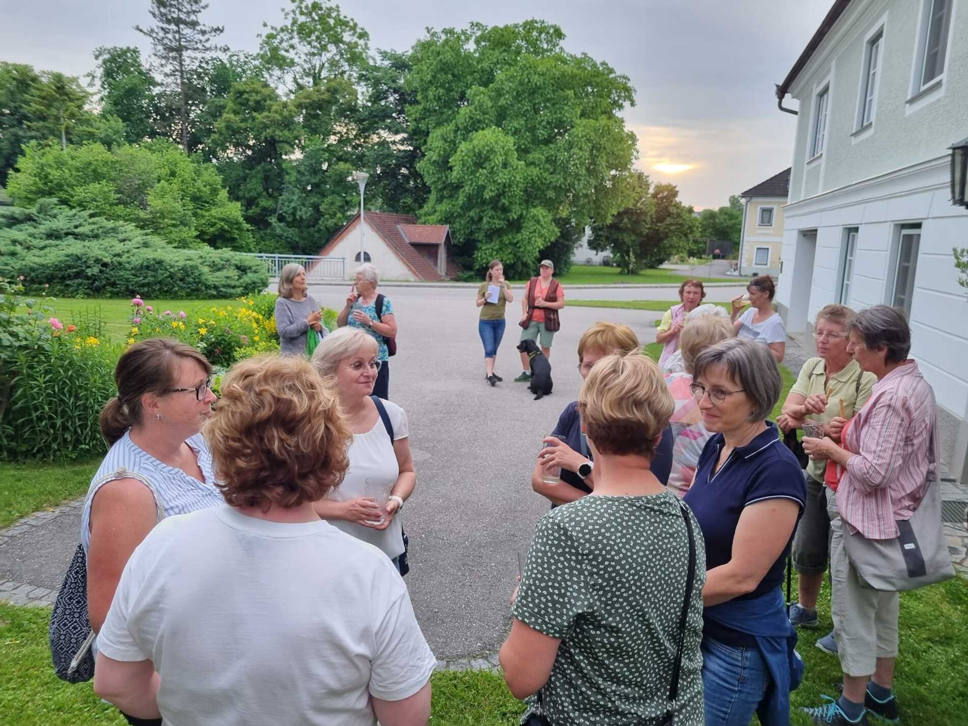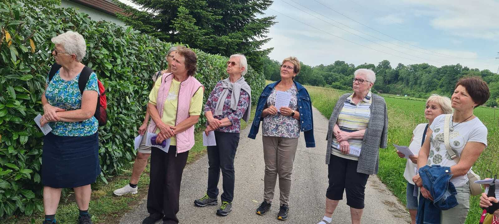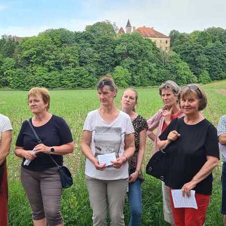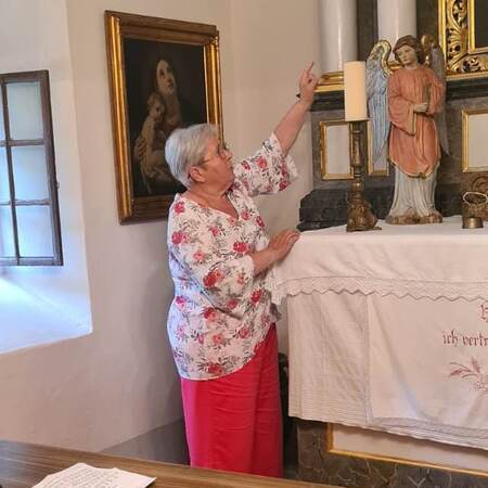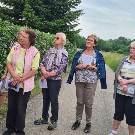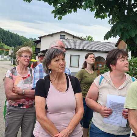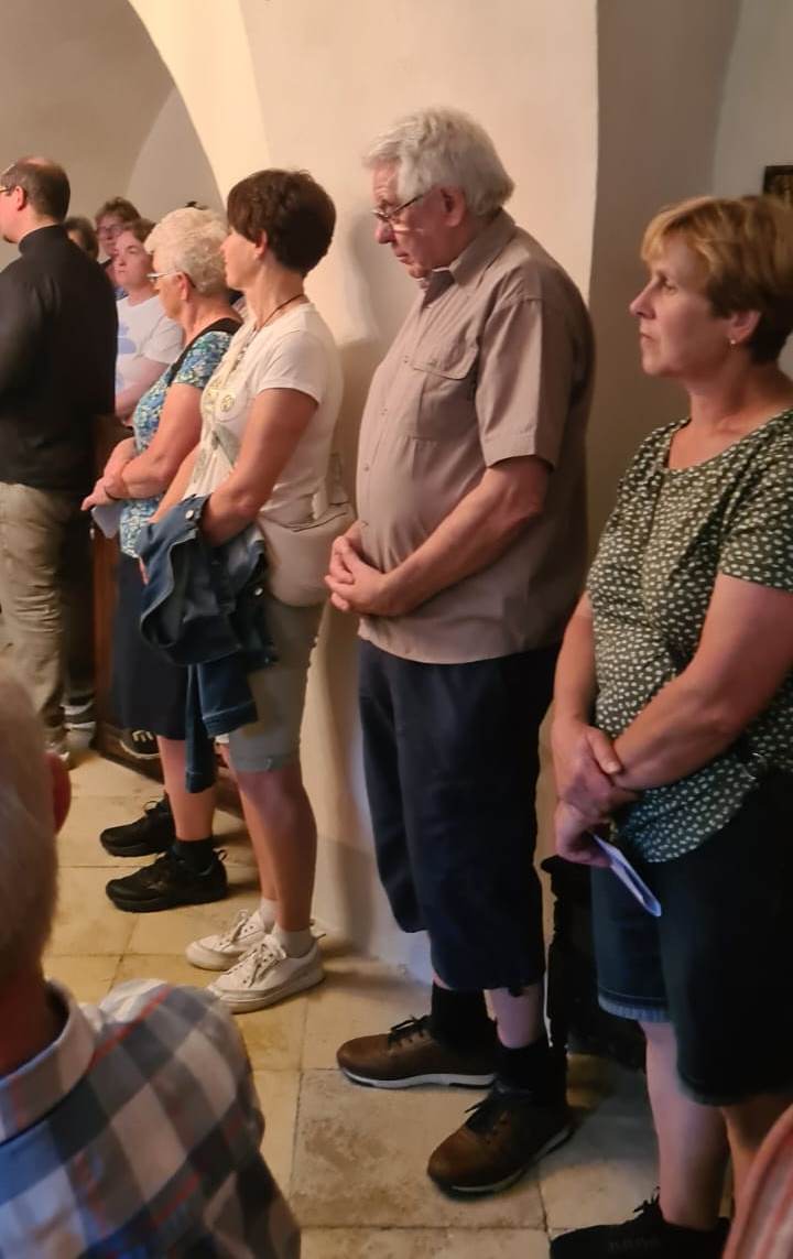 Gestartet wurde beim Bahnhof Kröllendorf, von dort ging es nach einer kurzen Begüßung durch Gerlinde Geiger zur Schwarenthorer Kapelle in der Nähe des Sportplatzes. Nach einigen Worten des Besitzers, Schwarenthorer Thomas, einem Marientext und einem Lied ging es weiter zur Kapelle ins Schloss Kröllendorf. Dort erzählte die Besitzerin Frau Andrea Kafka einiges über die Geschichte der Kappelle und des Schlosses. Nach dem Tagesevangelium fand Pater Vitus passende Worte zum Evangelium und zu den Kapellen. Weiter führte die Wanderung zurück zum Lagerhaus und dann entlang der Bahntrasse zum Marterl im Garten von Frau Anna Schnabl. Nach den erklärenden Worten zum Anna-Marterl gab es einen schönen, hoffnungsvollen und tröstlichen Meditationstext zur hl. Anna.. Die nächste Kapelle auf der Route war die Latzelsberger-Kapelle. Auch dort wurde gemeinsam gebetet, gesungen und Texte verlesen. Nach einer Trinkpause beim Hause Huber- Latzelsberger, die auf grund des warmen Wetters sehr gern angenommen wurde, ging es zurück zum Ausgangspunkt. Die Marienstatue im Garten der Fam. Bruckschwaiger bildete den Abschluss der Kapellenrunde. Auch dort wurde die Gruppe besonders herzlich empfangen und nach Fürbitten und einem Segensgebet mit Getränken und Brötchen bestens bewirtet.