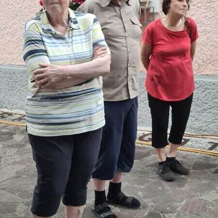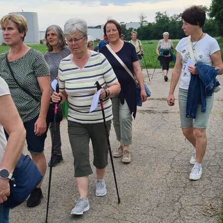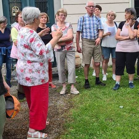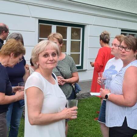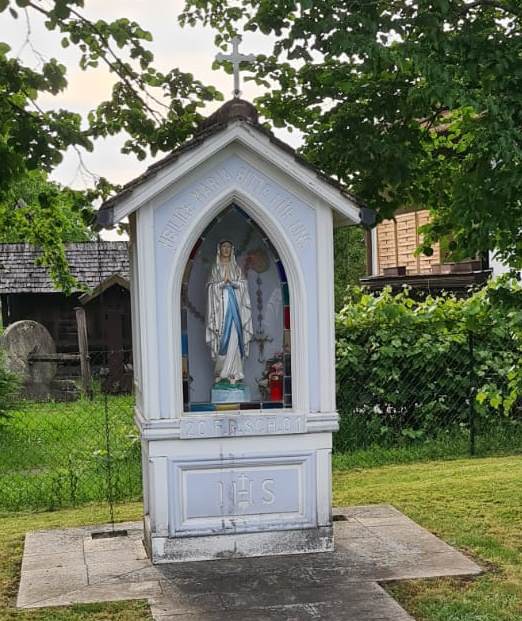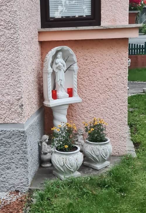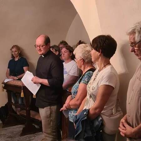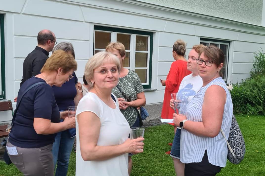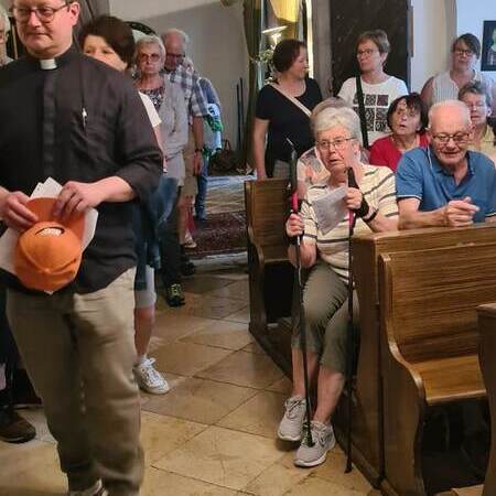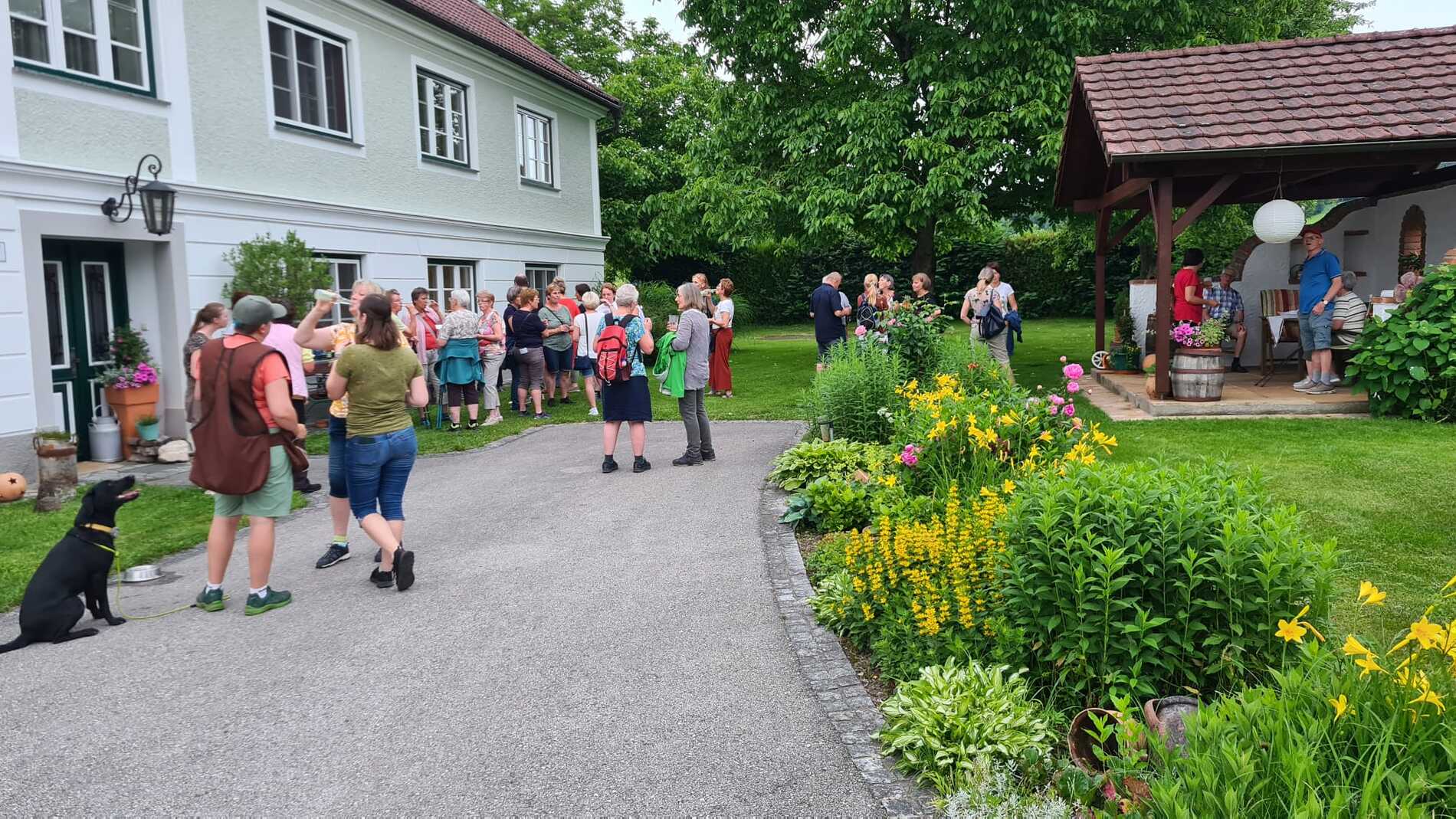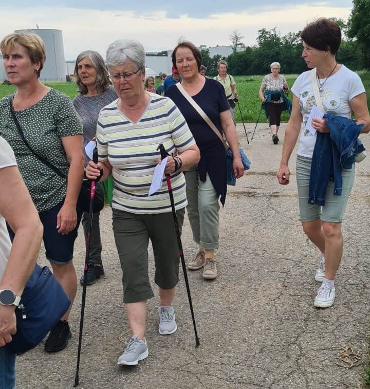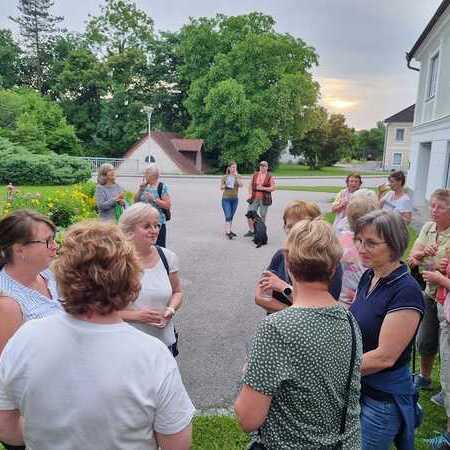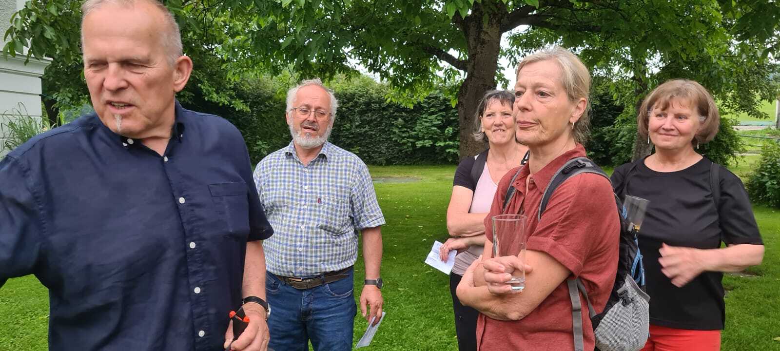 Gestartet wurde beim Bahnhof Kröllendorf, von dort ging es nach einer kurzen Begüßung durch Gerlinde Geiger zur Schwarenthorer Kapelle in der Nähe des Sportplatzes. Nach einigen Worten des Besitzers, Schwarenthorer Thomas, einem Marientext und einem Lied ging es weiter zur Kapelle ins Schloss Kröllendorf. Dort erzählte die Besitzerin Frau Andrea Kafka einiges über die Geschichte der Kappelle und des Schlosses. Nach dem Tagesevangelium fand Pater Vitus passende Worte zum Evangelium und zu den Kapellen. Weiter führte die Wanderung zurück zum Lagerhaus und dann entlang der Bahntrasse zum Marterl im Garten von Frau Anna Schnabl. Nach den erklärenden Worten zum Anna-Marterl gab es einen schönen, hoffnungsvollen und tröstlichen Meditationstext zur hl. Anna.. Die nächste Kapelle auf der Route war die Latzelsberger-Kapelle. Auch dort wurde gemeinsam gebetet, gesungen und Texte verlesen. Nach einer Trinkpause beim Hause Huber- Latzelsberger, die auf grund des warmen Wetters sehr gern angenommen wurde, ging es zurück zum Ausgangspunkt. Die Marienstatue im Garten der Fam. Bruckschwaiger bildete den Abschluss der Kapellenrunde. Auch dort wurde die Gruppe besonders herzlich empfangen und nach Fürbitten und einem Segensgebet mit Getränken und Brötchen bestens bewirtet.