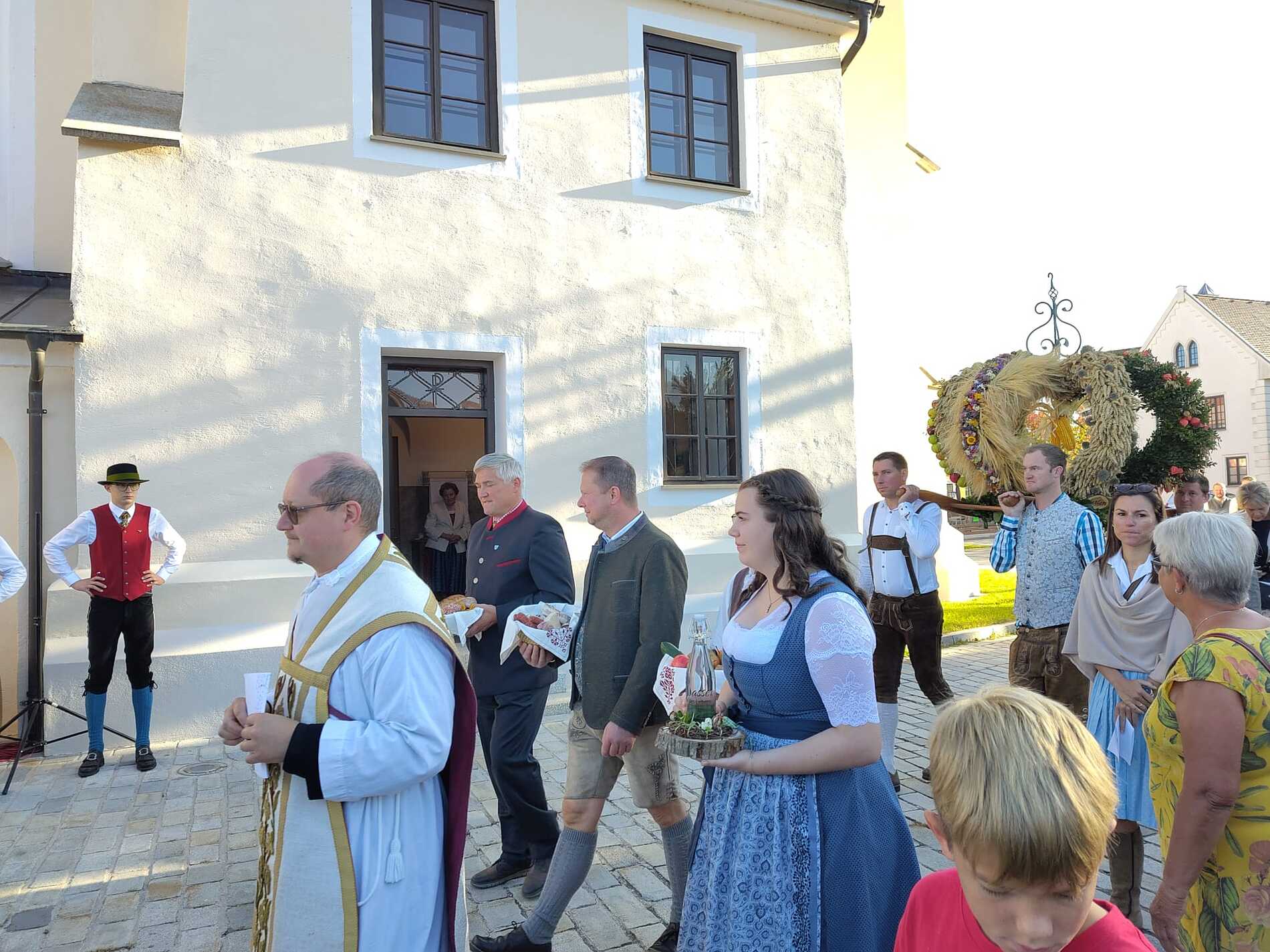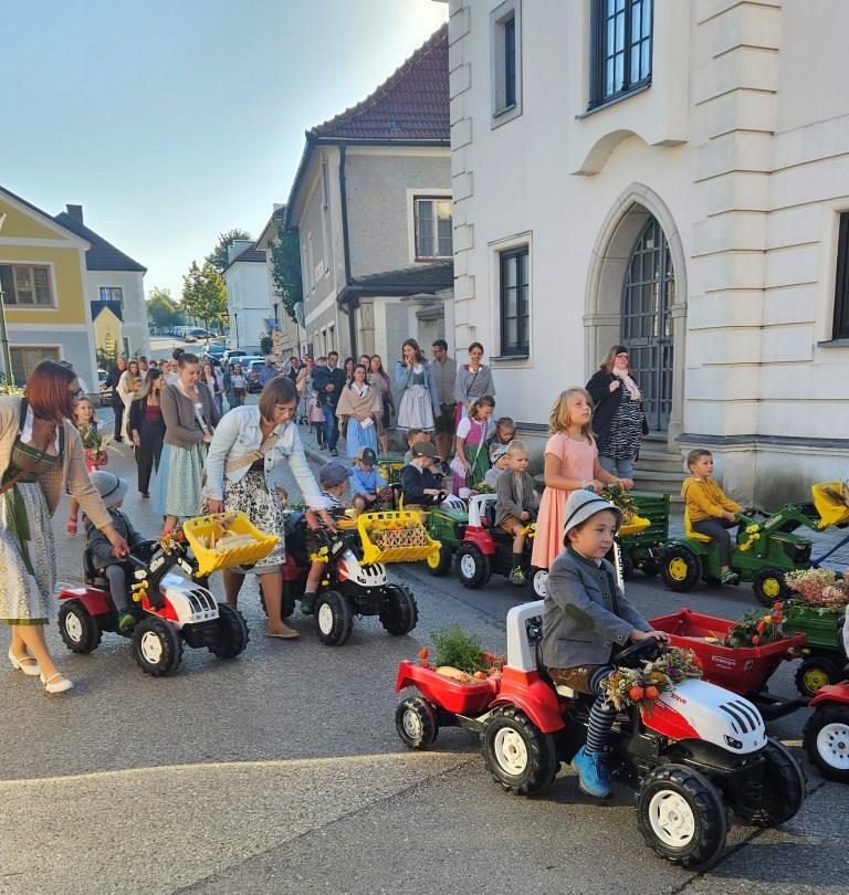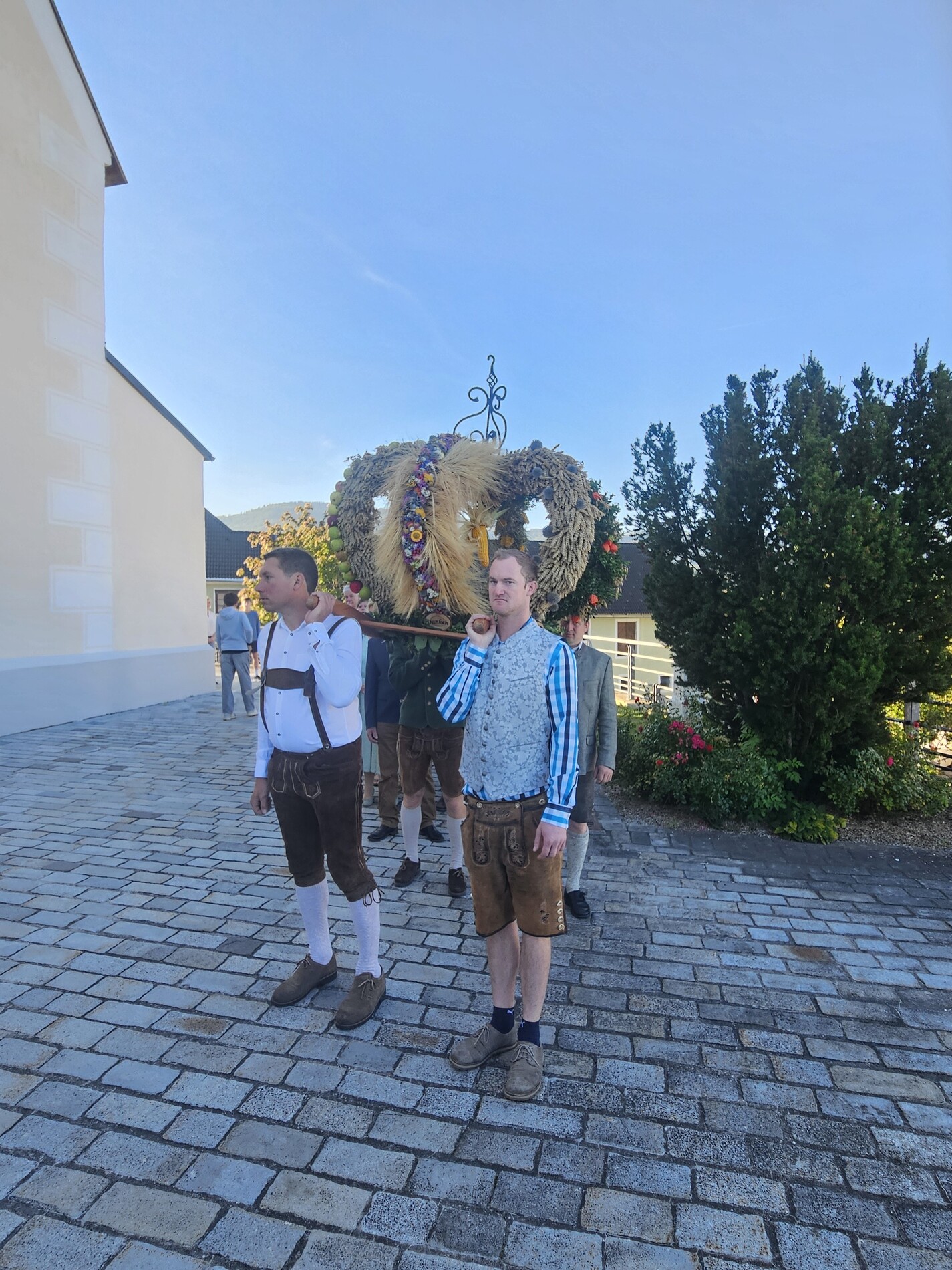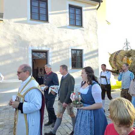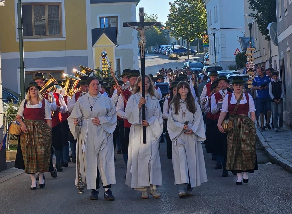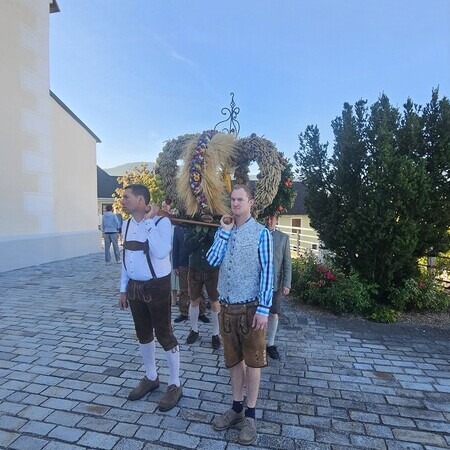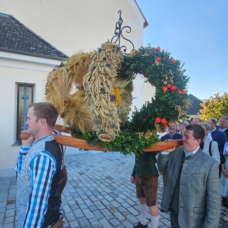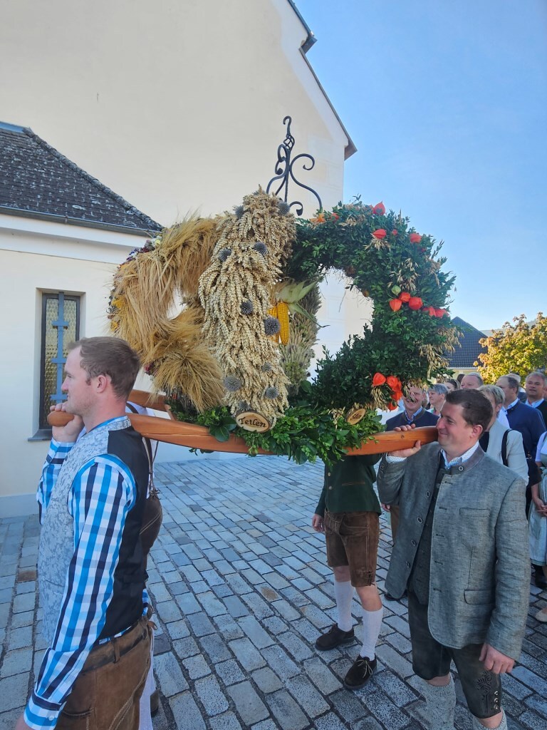 So wurde dieser Sonntag, zu einem besonderen Festtag des Dankes. Die TMK Allhartsberg feierte den Tag der Blasmusik. Die Musiker und Musikerinnen waren bereits seit den frühen Morgenstunden unterwegs in der Gemeinde um die Menschen mit ihrem Weckruf zu erfreuen. Sie begleiteten dann die prachtvoll von den Bäuerinnen und Bauern gestaltete Erntekrone vom Gemeindeamt zur Pfarrkirche. In dieser Krone spiegeln sich zentrale Werte unseres Lebens wider:
