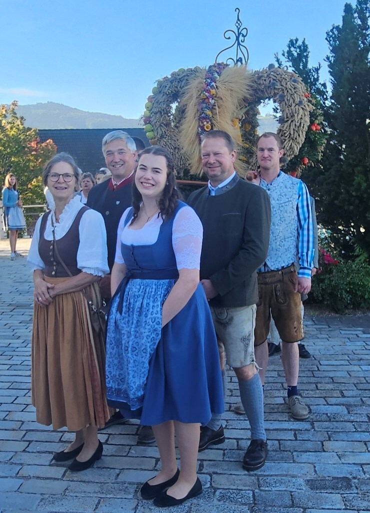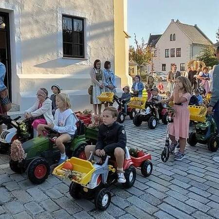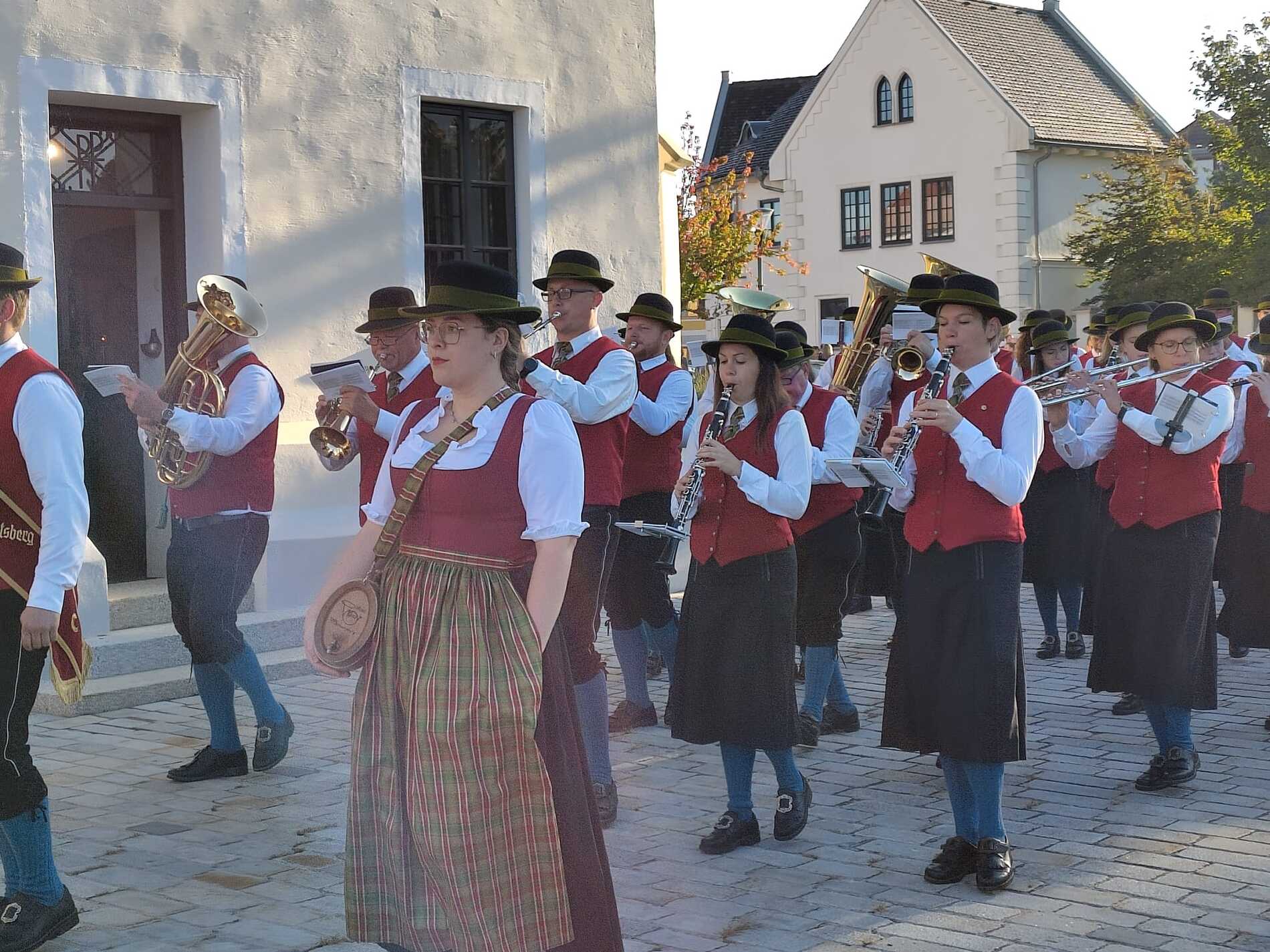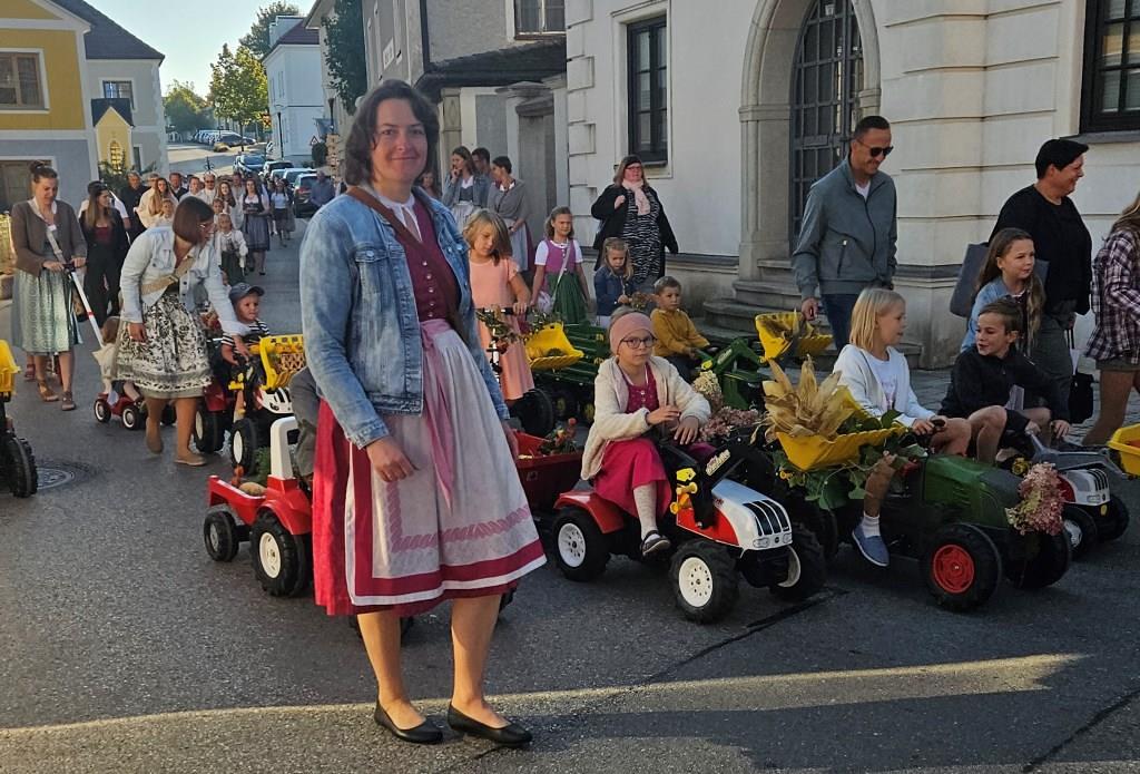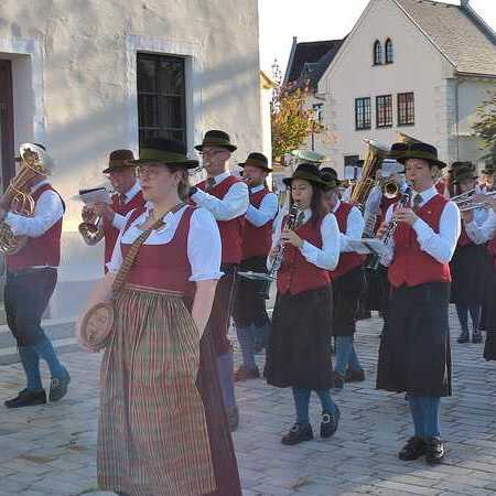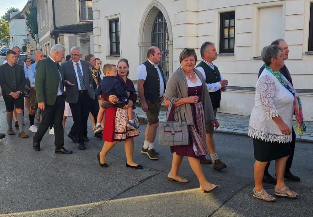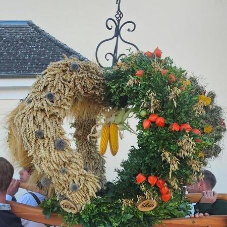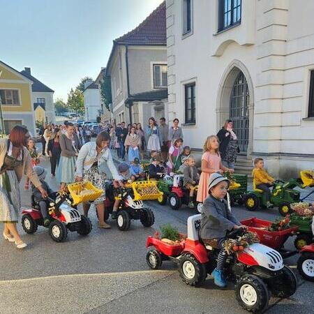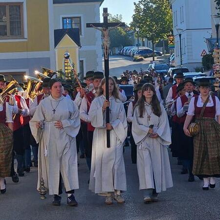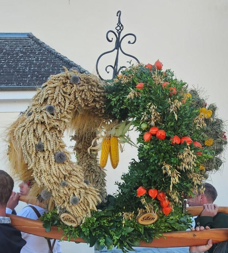 So wurde dieser Sonntag, zu einem besonderen Festtag des Dankes. Die TMK Allhartsberg feierte den Tag der Blasmusik. Die Musiker und Musikerinnen waren bereits seit den frühen Morgenstunden unterwegs in der Gemeinde um die Menschen mit ihrem Weckruf zu erfreuen. Sie begleiteten dann die prachtvoll von den Bäuerinnen und Bauern gestaltete Erntekrone vom Gemeindeamt zur Pfarrkirche. In dieser Krone spiegeln sich zentrale Werte unseres Lebens wider: