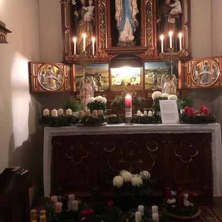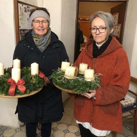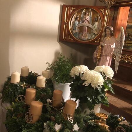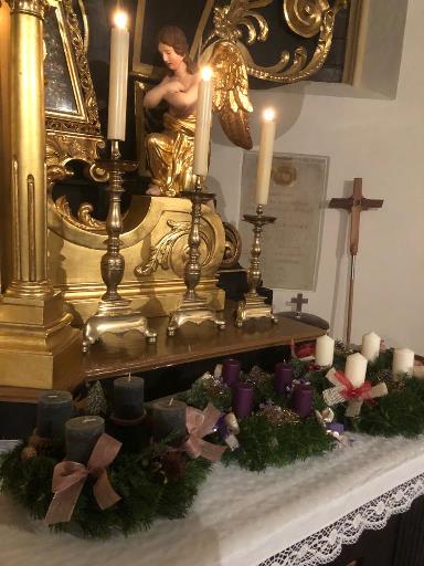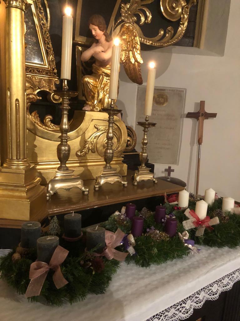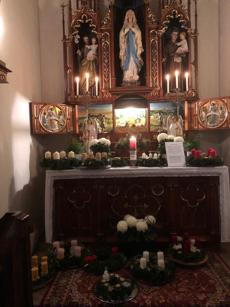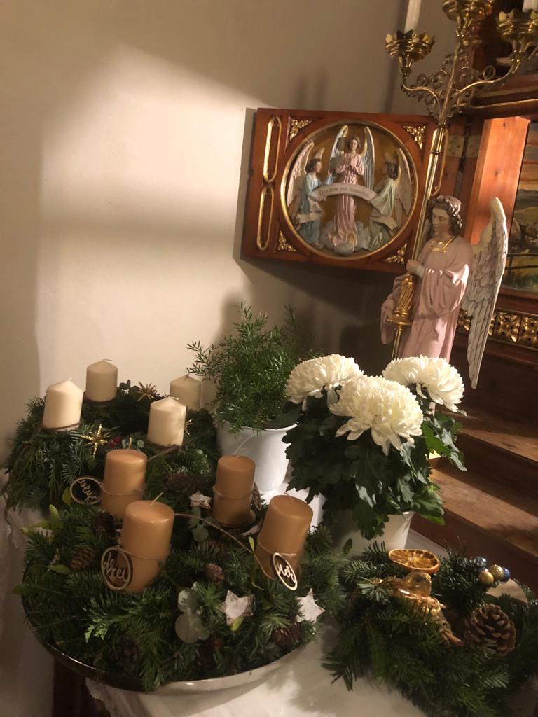 Er segnete alle mitgebrachten Kränze und den großen mit Liebe zum Detail von der Landjugend gebundenen und geschmückten Adventkranz, der den Altarraum ziert und mit seinen Kerzen Weihnachten entgegen leuchtet.