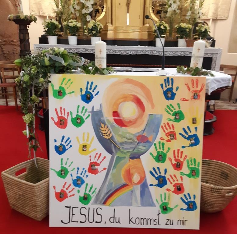 Die Erstkommunionfeier gestalten die Kinder sehr eigenständig mit Liedern, Texten und anderen Gestaltungselementen. Die Kinder tragen ihr Taufkerzen, und werden von ihren Eltern begleitet. Mit diesen Elementen und Zeichen möchten wir den Kindern und Erwachsenen zeigen, dass sie getauft sind und als Getaufte in einer lebendigen Gemeinschaft mit Jesus Christus stehen, der vor allem die Kinder einlädt, an der Mahlgemeinschaft mit ihm teilzunehmen.